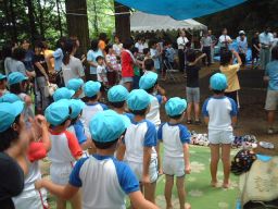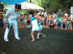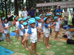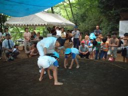 | 子供たちは夏体験ボランティアで来てくれた中学生のお兄ちゃんに相撲のとり方を教えてもらい、 練習してきました。お兄ちゃんは相撲大会でいつも優勝するすごいおにいちゃんです |