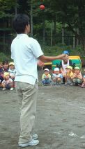 | 保育園で朝から夕方まで、一日中遊んでくれました。 運動会の練習の間に、ジャグリングを見せてくだました。 みんな、ビックリ。「すっご〜い!!」 ビックリしすぎて拍手を忘れてしまいました。 すごい!マジックみたい〜って、言っていました。園長先生のマジックの見すぎかな? |