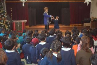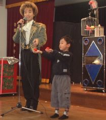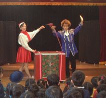 成木保育園のホールで千ヶ瀬第一保育園と駒木野保育園のお友達も 一緒に「渋谷慶太マジックファンタジア」のすばらしいマジックを見ました。 サンタクロースさんも一緒マジックを楽しみ、ビックリしていました。 |