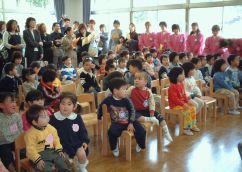 | 今年度もかわいいお友達がいっぱい入園してきました。入園式が始まります・ みんな、お椅子に座れたかな?? ![]() |