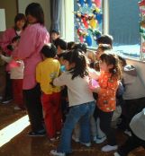 | ホールで豆まき、まずは自分で作った鬼のお面に豆撒きました。 心の中の、泣き虫鬼、いじめっこ鬼、好き嫌い鬼、みんな出て行け〜。 1階から鬼の声がして・・・・子供たちは、びっくり、 職員にしがみつく子、ピアノの後ろに隠れる子、舞台の幕の後ろにも。 それでも、勇敢にも立ち向かう子。 |