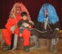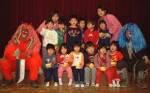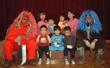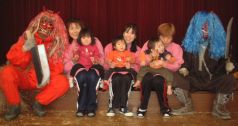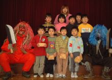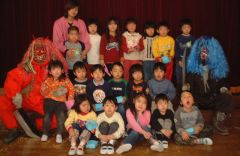| 今年は、鬼をやっつけてくれる用務員さんも来ない・・ いよいよ、ホールで暴れまわった鬼も疲れて、子供たちに良い鬼になる約束をしました。 みんなで、記念撮影・・・やっぱりこわい。 |