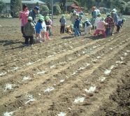広い畑に、いっぱいに植えました。 この後はじゃがいもが風邪をひかないように おじいちゃんたちが土をかけてくれます。 |