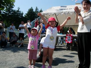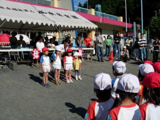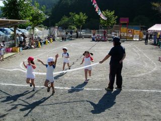 かけっこです。 みんな、頑張れ。がんばれ!! 小さい組はゴールテープの前で止まってしまって それがかわいいですね。 |