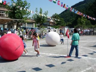 小学生、続いておじいちゃんや おばあちゃん、来賓の方々の 紅白大玉ころがし。 |