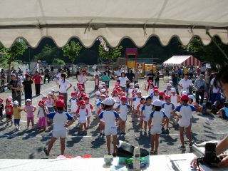 | 2004年10月2日 すばらしい青空に恵まれました。 お客様をお迎えするのは各クラスの動物さんたちの門。蓑虫の鈴がとってもかわいいです。 役員さんが共同募金も。。。。 |