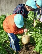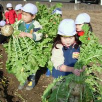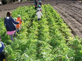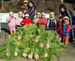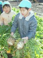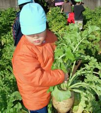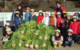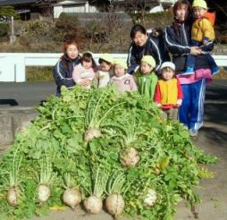 | 2004.12.24 8月末に畑に大根の種をまきました。 聖護院大根です。 大きなカブのようにぬいてみたい。。。。 子供の願いがかないました。 |