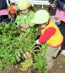 | 0歳児からみんなで畑に行きました。 力を入れて、うんとこしょ・・・1歳児も頑張ります。 |