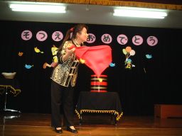 | 恒例の園長先生のマジック・・・子どもたちは少しずつ椅子から離れてどんどん前に。 果物、大きな布、つぼと出るたびに大騒ぎでした。 頭の中に????????????????が残ったのはかえって大人?。 前日、ある卒園児の男の子から「玉すだれとマジック教えてくれてありがとう」と ラブレターが来ました。 |
