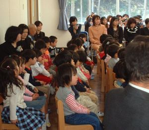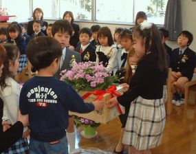 楽しかった保育園とも今日でお別れです。 22名の子供たち、先生手作りのお花を胸に、ちょっぴり緊張・・ |