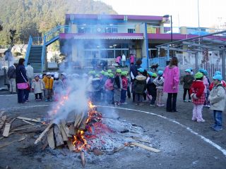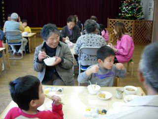 | 今年から、各クラスでお食事です。 ぞう組はホールで高齢者クラブの方と一緒。 小さいクラスは保護者会の役員さんたちと一緒。 今年もいろいろな交流事業をしました。いろいろな経験が出来ました。 2006年1月には、まゆだまつくりを教えていただくことになっています。楽しみです。 |