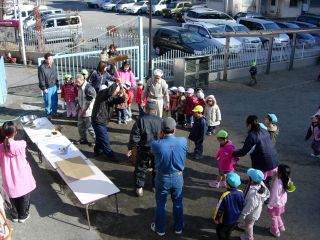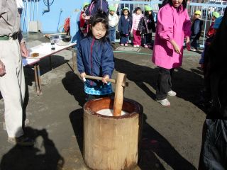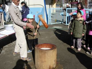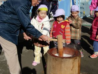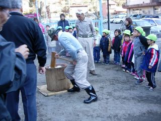 | 高齢者クラブの会長さんやおじいちゃん、おばあちゃん 保育園の理事監事のおじさんたち、 そして、保護者会の役員さん、有志のお父さん。 みんなでお餅つき |