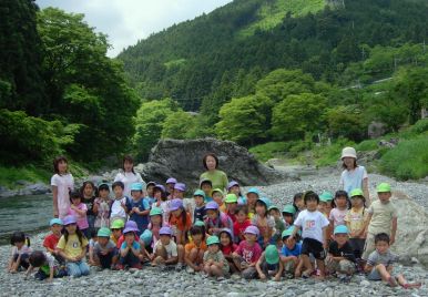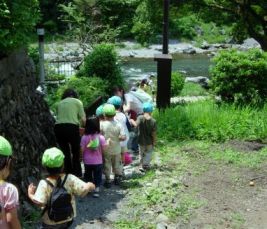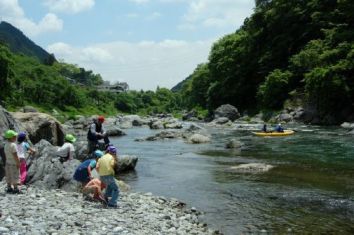 | 成木保育園の前も川があるけど・・多摩川はスケールが違う。 思い切り、石を投げたり。 あっカヌーが・・・どこまで行くのぉ、気持ちよさそう。 |