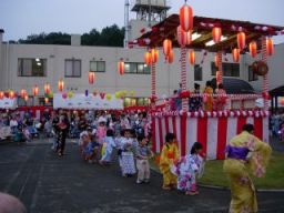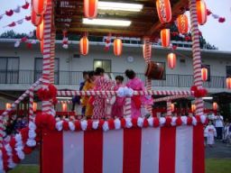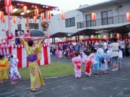 | 午後6時30分 盆踊りの開始です。 ぞう組の女の子がやぐらに上がりました。 |