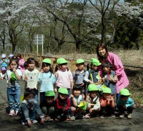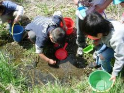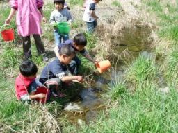 | 2005年4月9日には、、卒園した子どもたちが遊び (卒園児との交流事業) に来ました。 一年生になって、ちょっと緊張していた子どもたち、久々にお友達に会ったり先生に会ったり ほっとしたような笑顔でした。川におたまじゃくしを取りに行きました。 簡単なお昼を食べて、「また ね〜」と帰っていきました。 |