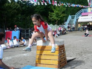 ひとりひとり名前を呼ばれ、前転、飛び板、ネットや平均台、跳び箱を飛びました。