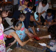 | 踊り終わるころ、あたりは暗くなり、 ホームで用意してくださった、金魚すくい、風船、スーパーボール 焼きそば、たこ焼き、カキ氷、フランクフルトなどなど数種類。 食べ過ぎないようにお楽しみ券引き換えで、いただきました。 |
