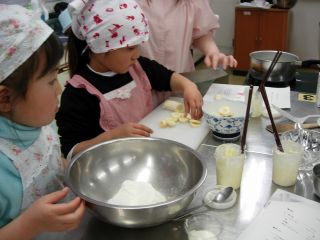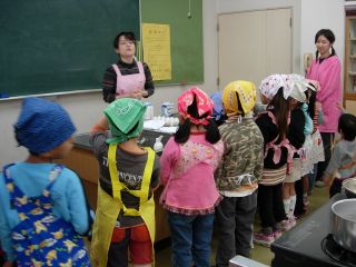 | 成木市民センターの調理室で お料理教室をしました。 栄養士さんが、牛さんのこと、牛乳のこと、 チーズのこと、バターのこと いろいろにお話をしてくれました。 |