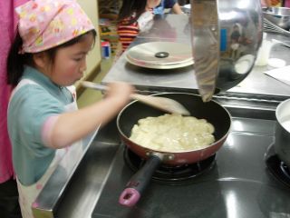 | パンケーキがこんがりと焼けて、手作りバターをのせました。きな粉ミルクと一緒に「いただきまーす」 | |