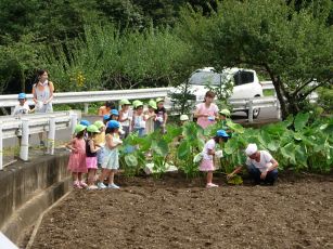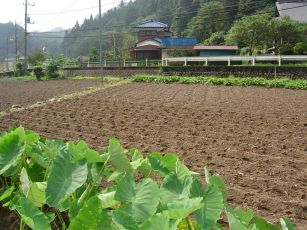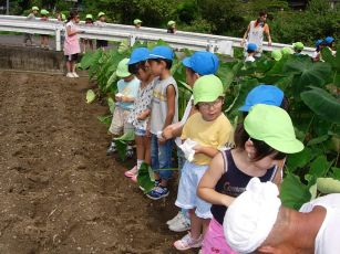 | 畑にはサツマイモと八つ頭の葉っぱが 大きく育っています。土の下のお芋も大きいかな? 秋が楽しみです。 |