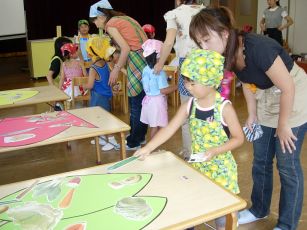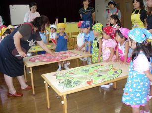 | きいろの食べ物 あかの食べ物 みどりの食べ物 さて、裏返しになっている食べ物カードを それぞれの場所にお母さんと一緒に置きます。 |