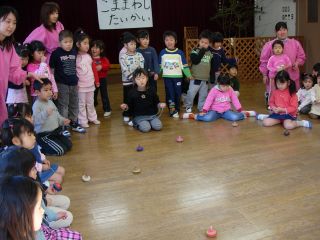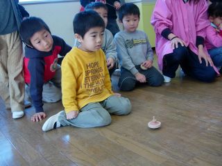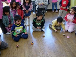 | 平成18年1月11日 コマまわし大会をしました。 昨年の暮れに、白木のコマを子ども達に渡し、 お正月の間に、お家の方と一緒きれいにしあげて、まわす練習もしてきました。 |
