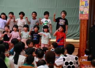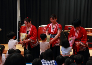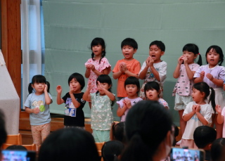 2025/9/12 敬老の日の集い 今日はおじいちゃんおばあちゃんを招待して 敬老の日の集いを行いました。 ぞう組きりん組ぱんだ組からは歌と手話の披露がありました。 この日の為に一生懸命練習してきました。 女性和太鼓グループ「雅(みやび)」 による太鼓の演奏が披露されました。 おじいちゃんおばあちゃん、 元気で長生きしてね。