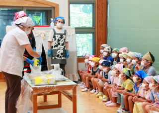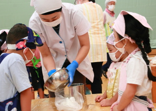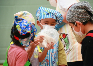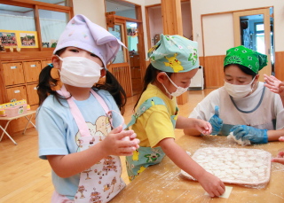 2025/9/25 調理保育 (月見団子作り) きりん組とぞう組は調理保育として、 月見団子作りをしました。 給食の先生が粉と水をいれて、 みんなで揉みこみました。 生地を手で丸くして平らにして、 五円玉の大きさの団子を作りました。 みんなで作った団子は給食室で茹でて おやつで食べました。