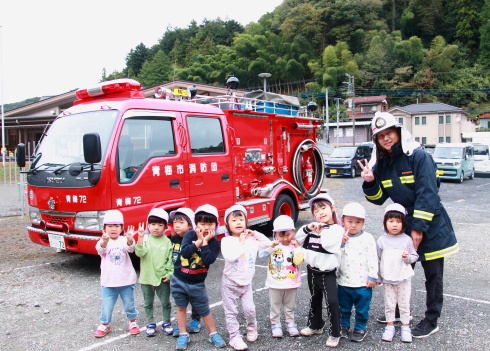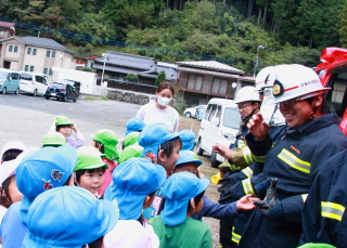 きりん組・ぞう組が実際にホースを持って放水体験をしました。