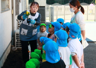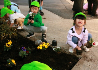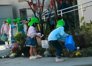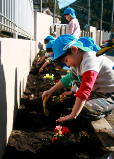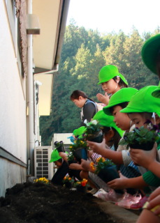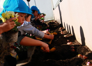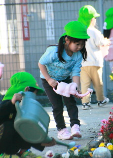 2025/11/14 花と球根植え 今日はぞう組・きりん組で、 ビオラとパンジーと球根植えを行いました。 花がさしてあるポットをもんで、 やさしく外して植えました。 そして、ぞう組がチューリップの球根を ビオラ・パンジーを避けて間に植えました。 植えた後はしっかりと水やりをしました。