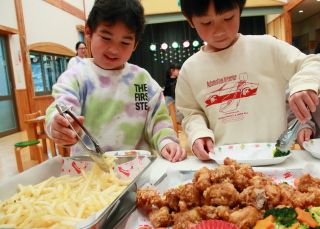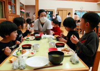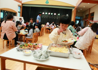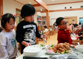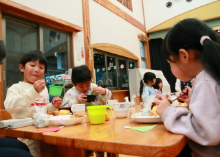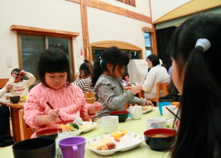 ホールでみんな一緒に給食を食べました。