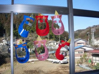 子どもたちが作ったお面が、ホールの窓につけられました。