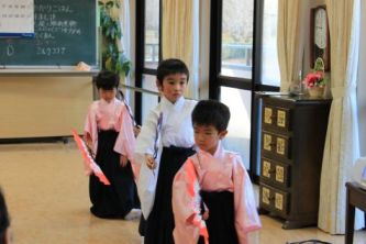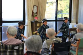 終わった子どもたちは、お年寄りの周りに集まって、見ていました。
