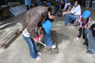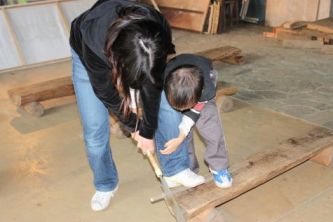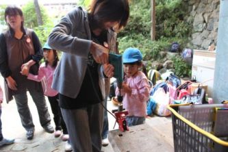 木をのこぎりで切ったり、電動ドリルで穴を開けたり、お母さんたちも頑張っています。