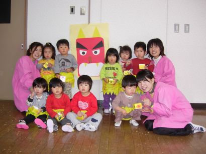 ホールにみんなで集まって、豆まきのお話を聞きました。