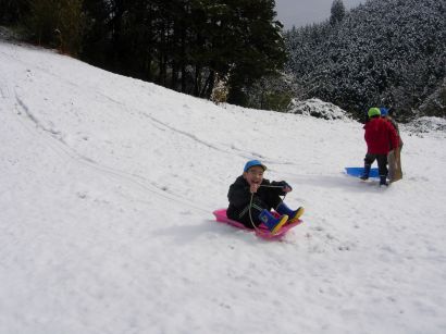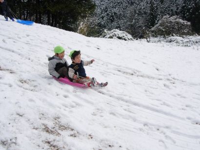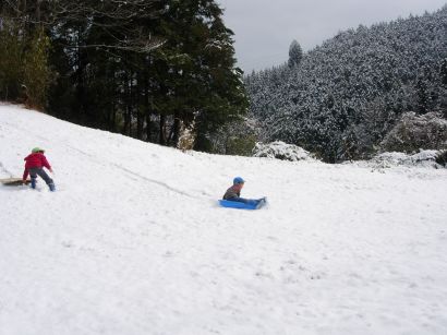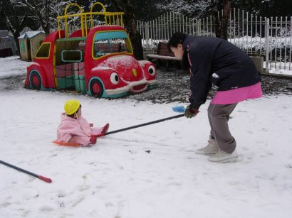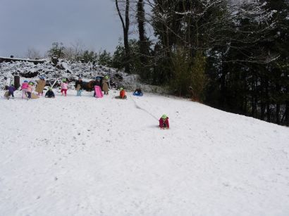 ぞう組ときりん組の子どもたちは、成木6丁目にそりあそびに出かけました。