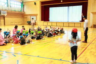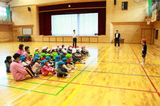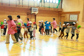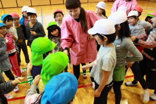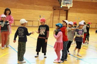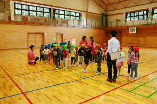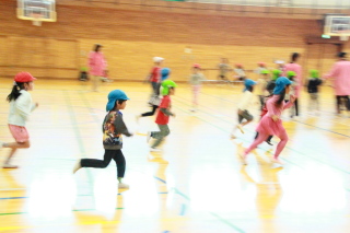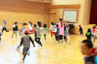 成木小学校との交流 広い体育館で、小学生の用意したゲームなどで、思い切り走りまわってきました。 |