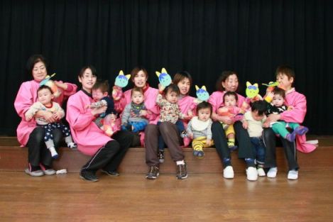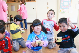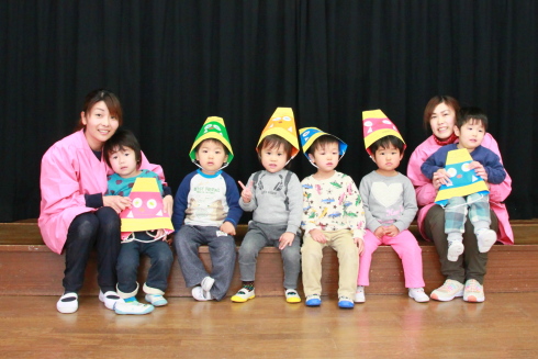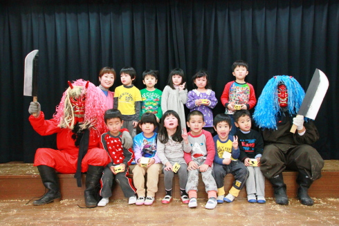 節分、立春のお話のあと、各クラスの鬼のお面の紹介、