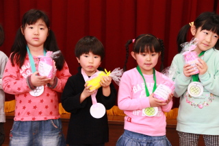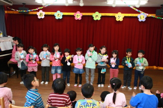 ゲームのあとは、小さいクラスから、ぞう組にプレゼント。