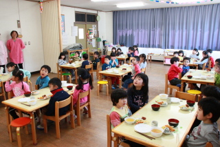 ぞう組も、小さい組も、先生も、一緒に食べるとおいしい。