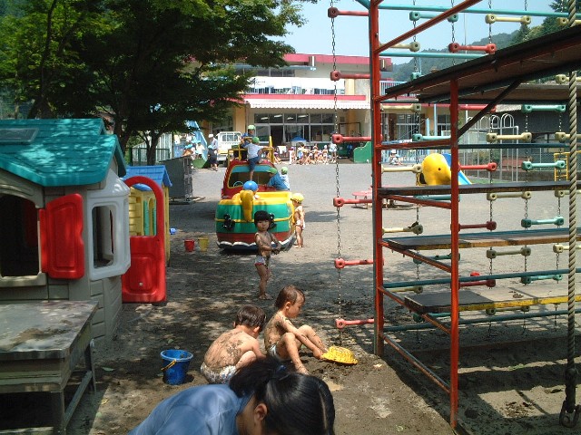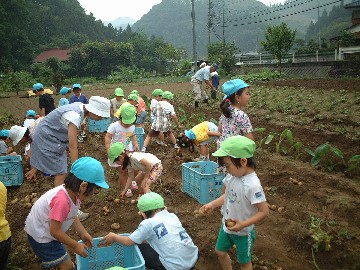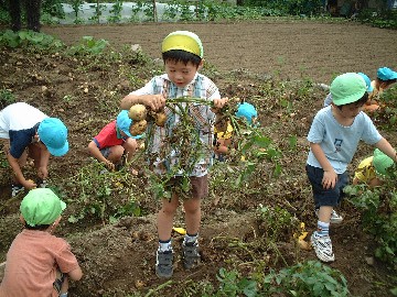 | 13年6月27日、5歳児ぞう組が自分で植えたじゃが芋を掘りに行きました きりん組も一緒に。そして、おじいちゃんやおばあちゃんは畑に先に行って 待っていてくれました。 |