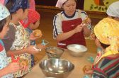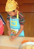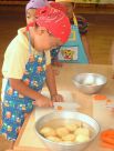 可愛いエプロンをして・・・ 自分たちでじゃがいもの皮をむいてみるね。 簡単そうだけど、結構難しい!! |