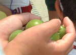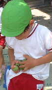 | 大きいクラスのお友達が、梅の実を洗ってくれます。 「干して置くところまで運んでね・・・落とさないでね。しっかり持ってね・・」「わかった。」 |