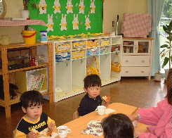 | うさぎ組 新しい部屋での生活もすっかりなじみ、友達の名前を呼び合って一緒に遊んだり 物の貸し借りも上手になってけんかも少〜しずつ少なくなってきました。 朝や帰りのお支度も自分から進んでやるようになって、 ちょっぴりお兄さんお姉さんらしくなってきました。 |