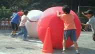 最初は小学生、続いておじいちゃんや おばあちゃん、来賓の方々の 紅白大玉ころがし。 とっても大きいので 迫力満点 |