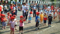 | 開会式、小さい子も並んでお話を聞きました。 先生に抱っこはだあれ? |