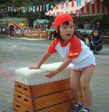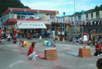 | 最初は小学生、続いておじいちゃんや おばあちゃん、来賓の方々の 紅白大玉ころがし。 とっても大きいので 迫力満点!! |