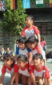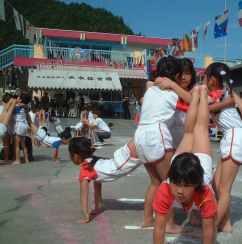 | いよいよ、ぞう組ときりん組の組体操です。 カメラを持つお父さんお母さんもたいへん!! でも、もっと拍手をして欲しいなぁ。 |
