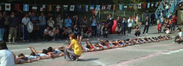 | 最後の体操。みんないっぱい頑張りました。 たくさんの人たちに見ていただき 応援してもらってよかったね。 朝は曇っていたけど、みんなの元気で 雲も飛んでいってしまいました。 |