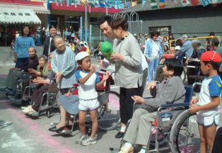 九十九園、あゆみえんのおじいちゃんや おばあちゃんと一緒にふうせん送りゲームをしました。 |